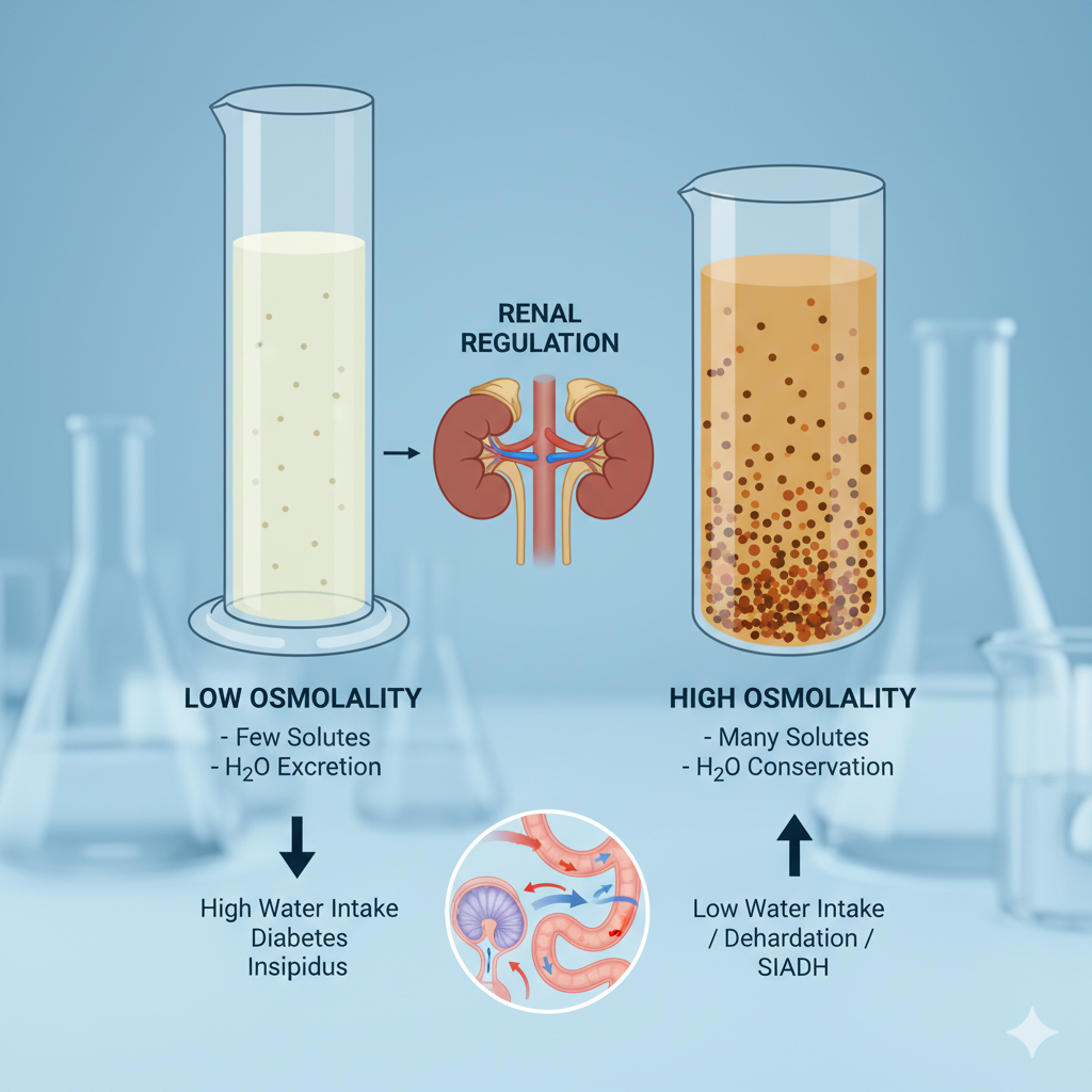 Blood Serum Urine Osmolarity Osmolality Calculator free online for calculation of chemicals dissolved in the serum/blood/urine. Chemicals that affect the osmolality test include sodium, chloride, bicarbonate, proteins, and sugar (glucose). Formulas Used: Osmolality = (2 x (Na+K)) + (BUN/2.8) + (Glucose/18) where, Na – Sodium K – Potassium BUN – Blood Urea Nitrogen Glu – Glucose/sugar Osmolality vs Osmolality in urine The main difference: Osmolality is based on mass (\(kg\)) of solvent, while osmolarity is based on volume (\(L\)) of the solution. Why they are used interchangeably for urine: Because urine is mostly water, one liter of water has a mass of about one kilogram. This makes the numerical difference between osmolality and osmolarity negligible for most practical purposes in medicine. Which is more accurate: Osmolality is the more precise measure because the mass of the solvent (water) does not change with temperature, while the volume does. Why both are used: Osmolality is the preferred measure for accuracy, but osmolarity is often more practical for calculations and measurements in liters.